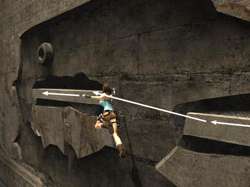 Climb away from the corner along this handhold, tapping Interact all the way to go faster. At the end, lean out and jump to grab the next handhold, just a little higher up on the same wall. Quickly climb to the left until Lara is hanging below the dart pipe.