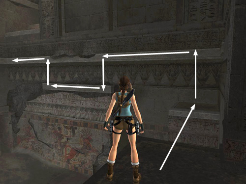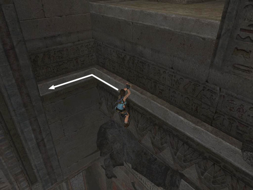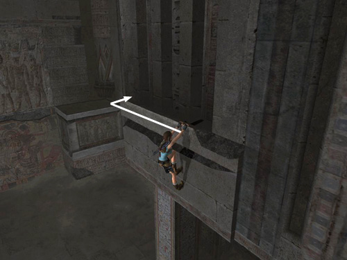 Take a running jump from the doorway to the square ledge in the corner. Grab the handhold on the wall above and climb to the left. Drop to grab the handhold below, climb to the right past the broken section of the upper handhold. Then jump up to grab the solid section of the upper handhold.