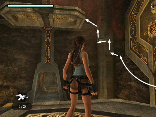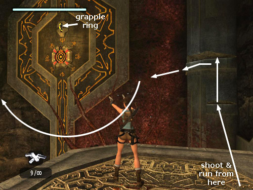 After shooting the button for the first time and killing the flying mutant, move to the right edge of the ledge near the wall. Get Lara in position to make a running jump toward the corner pillar. Then shoot the button again until all the glyphs are lit, giving you the longest possible time until the ring retracts. Now take that running jump to grab the lower crevice on the corner column. Jump up to the higher one and quickly climb around to the left. (Tap Interact to go faster.) Jump back off the column, grapple the ring and run to the left.