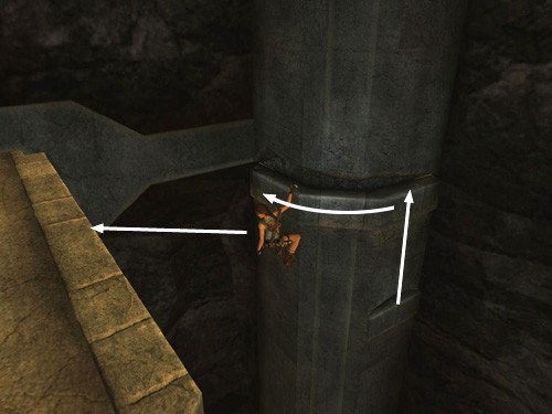 From here on, you can take your time. Jump up to grab the crevice above, which runs around the column. Climb around to the left and jump back to grab the wide ledge behind you. Pull up to CHECKPOINT 6.