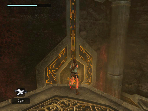 Position Lara on the retracting ledge so she's facing the button and the grappling ring above it. Shoot the button once more until all the glyphs glow to max out the timer. Then take that running jump, taking off just to the right of the outer corner and aiming a little to the left of the vertical yellow design on the wall ahead, as shown in the screenshot above. Be sure to jump just at the edge and hold down the Jump key to keep Lara in the air longer.