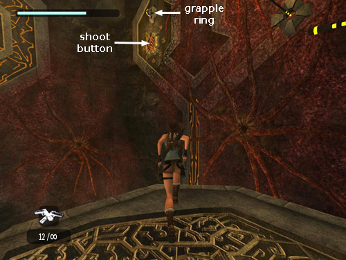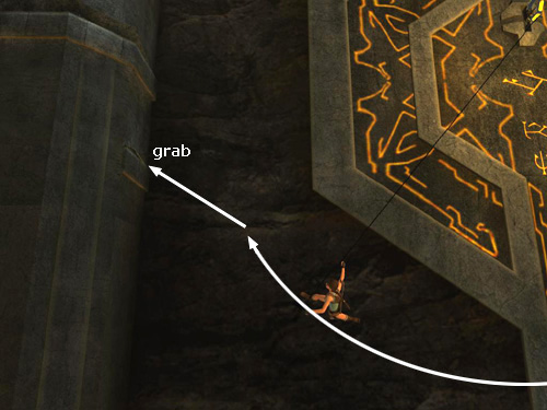 As she nears the wall, release the Forward and Jump keys and press Grapple to snag the ring above. This may take a number of tries, but once you succeed, you'll have much more time remaining than you would if you'd used the poles.