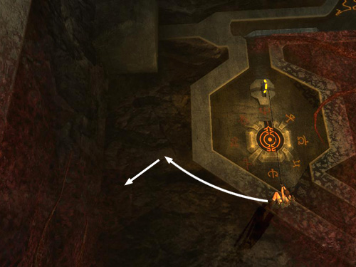 Retract the cable so Lara's feet are on the raised stone border just below the ring of glyphs. You'll probably need to reel the cable in six times to reach this height. Do it as quickly as you can. With the cable this short, you should be able to wall run to the left just once and jump to land on the broken column in the left corner.