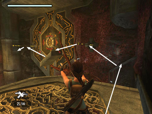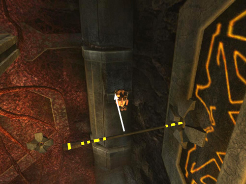 The screenshot above shows an overview of the whole sequence. Begin on the right side of the ledge, near the wall, facing the broken support column in the corner. Shoot the button again until all of the glyphs are lit. Take a running jump toward the broken column. Make sure you jump just at the edge of the ledge and hold down the Jump button to keep Lara in the air as long as possible. Then she should land near the middle of the slope.