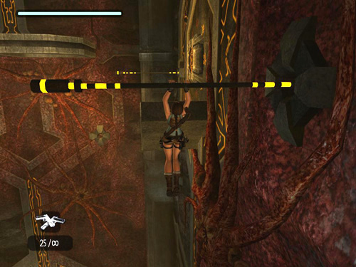 After taking a running jump to that first slope, slide just a little and immediately jump to grab the first horizontal pole. Lara should grab the pole near the middle (as shown above), rather than at the outer edge. Then she'll be in a good spot to swing around and jump onto the stone slope ahead. If she doesn't travel far enough on that initial running jump, Lara will grab the left end of the pole and be unable to swing and land on the slope.