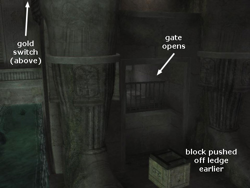 After pushing the carved block off the ledge in front of the Horus statue and then using the lever between the two statues to lower the water level once more, climb the Anubis statue and make your way over to the gold switch on the side of the Horus statue, as described in the walkthrough.