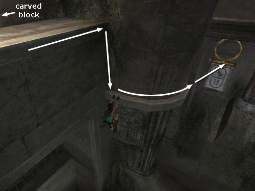 The entire subterranean pool sequence is also shown in this video walkthrough. After solving the SECOND METAL SCARAB PUZZLE and opening the gate above, do not climb up and pull the switch to raise the water level. Instead turn to face out over the pool.