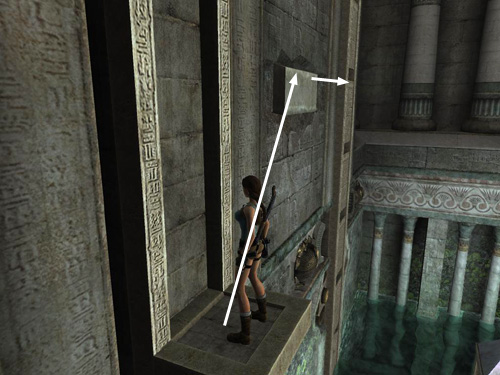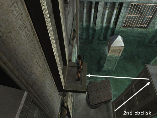 When the second scarab mechanism locks in place, drop down and climb the obelisk you just raised. (Or jump back off the panel to grab the obelisk and climb to the top.) When Lara is hanging from the top edge of the obelisk, jump back to grab the small jutting ledge above the carved panel. Pull up.