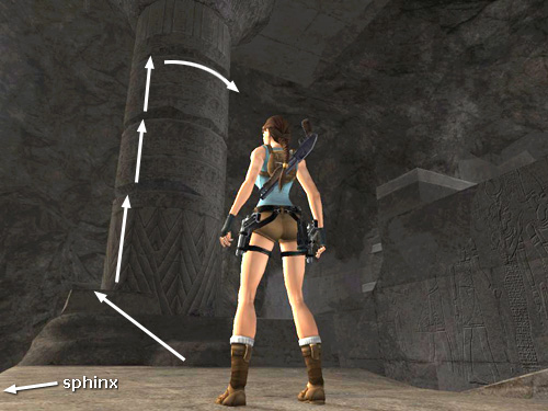 Climb around to the right again so the sphinx is ahead on Lara's right. Jump up to grab the broken top of the column, pull up and vault up onto the ledge ahead.