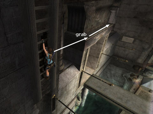 Climb down to the bottom of the ladder and jump to the right to grab the lintel above the carved door.