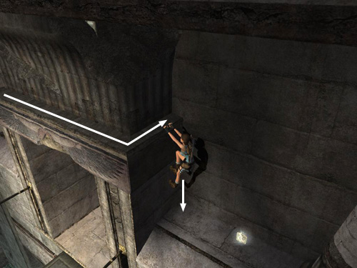 Once you have the artifact, grab onto the lintel again and climb around to the left until Lara is hanging in front of the open door. Drop onto the walkway.