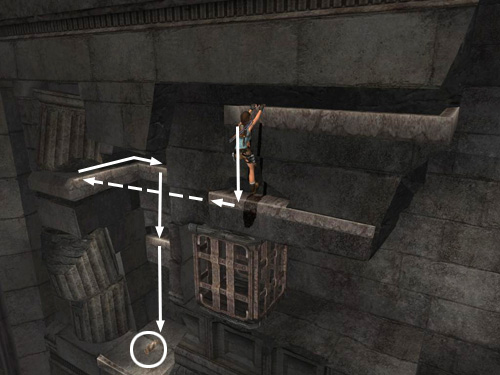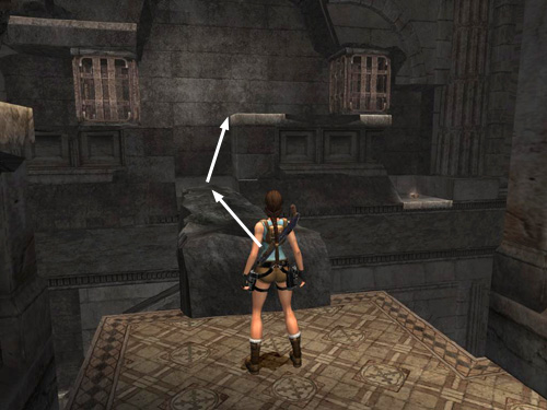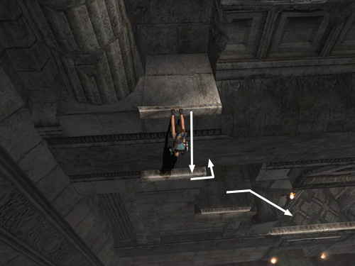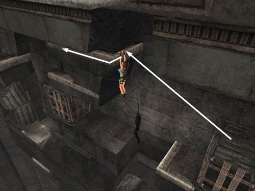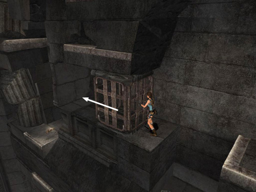 Pull the first metal box as far as it will go. You may have to ease it out gradually to keep it from sliding back. Hang from the edge so Lara's back is toward the open room. Climb to the right and jump past the gap in the ledge to grab on the other side. Climb around to the right and drop down near a small medipack. Return the way you came to the end of the fallen column between the two metal boxes.
