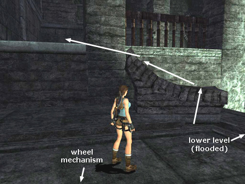 Climb onto the inverted stone archway near the wheel mechanism. Jump from there to the wall ahead. Then drop down on the other side, where you were before.