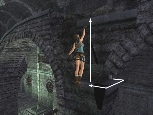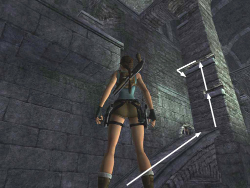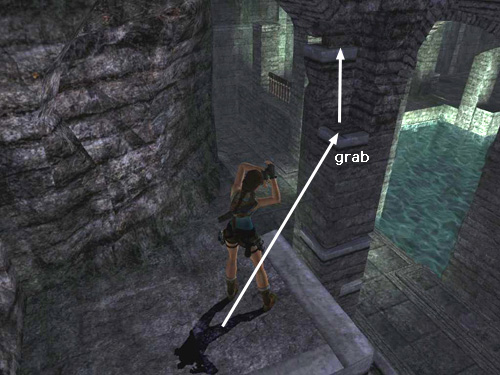 Take a running jump to grab onto the corner handhold on the square pillar. It's a long jump, so be sure to hold the Jump key down for a moment after takeoff. Then press Interact to keep Lara from slipping when she catches the handhold. Pull up, grab the next handhold and climb all the way around to the other side of the pillar.
