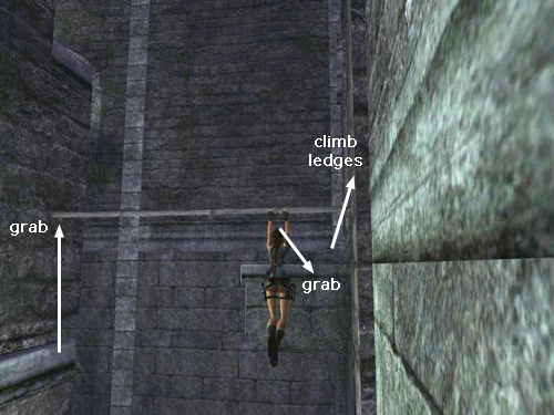 Jump straight up to grab the horizontal bar. Climb to the other side of the bar and face the corner ledge. Swing around, jump and grab onto it. Pull up and climb the handholds in the alcove to reach a small ledge overlooking the horizontal bar.