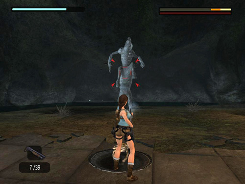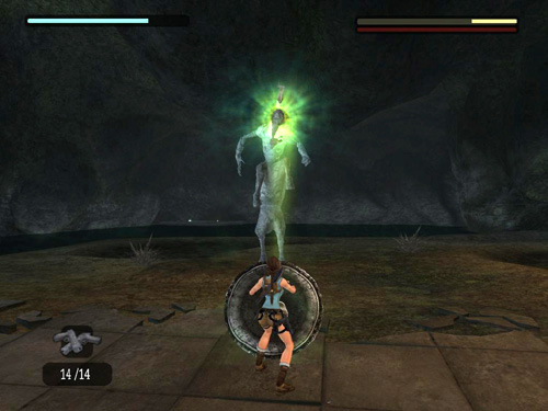 When the centaur you're attacking becomes enraged and starts to stare green rays at Lara, run to the shield and press Interact to pick it up. If necessary, press Left/Right to pivot on the spot and face the centaur. (Lara can't run with the shield, only pivot.)