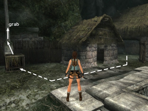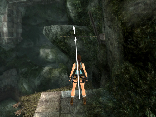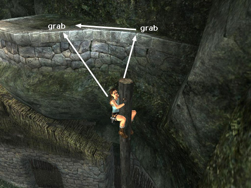 If you're unfamiliar with the controls, the jump from the pole to the ledge can be a little challenging. Try pointing the camera toward where you want Lara to grab. Then press Forward + Jump. Alternatively, jump and grab the narrow part of the ledge against the wall, then traverse to the left to where the ledge widens (as the arrows on the right indicate) and pull up. The bats appear as soon as Lara touches the ledge, however, so make sure you traverse and pull up as quickly as you can.