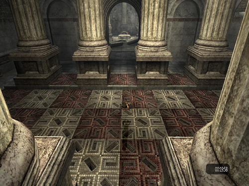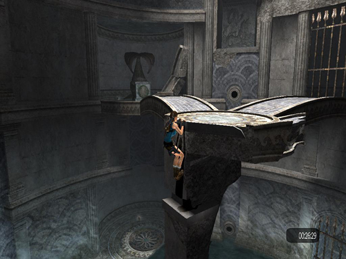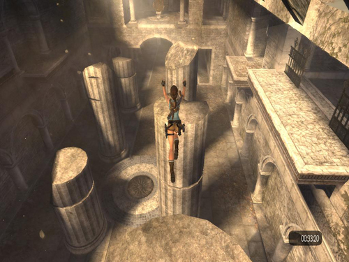 Head for the end of the room farthest from the entrance and climb the column on the right. If you climb up its left side, you can climb straight to the top without having to circle around it. This is the fastest way to get to the upper level.