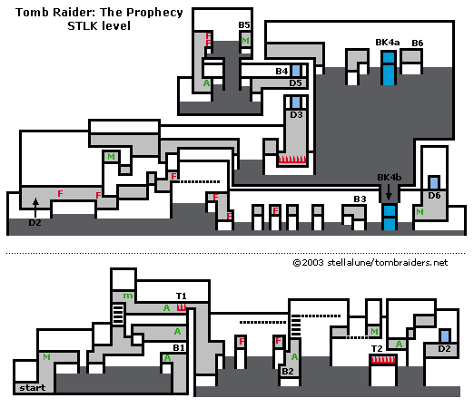 NOTE: Buttons and switches are numbered to match their corresponding doors, gates, etc., (e.g., Switch 1 opens Door 1, Switch 3 disarms Trap 3, etc.). All pickups are marked on the map. Enemies and some hazards are noted in the walkthrough but not on the maps.