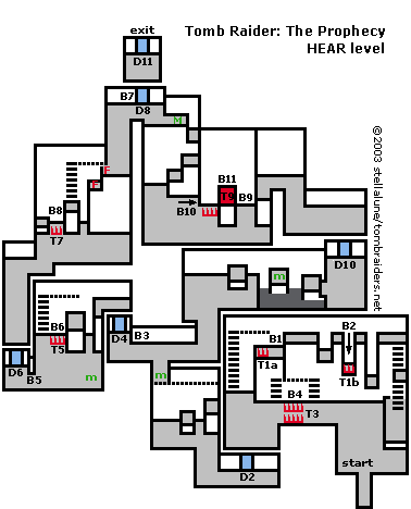 First, make sure you pressed the button below (B9). When pressed, the middle part of the button looks dark instead of golden. If you didn't press it, Lara will fall on some invisible trap (T9) and die when she jumps over to the other button. If necessary, drop down and press it now. Then retrace your steps back around to this point. Once the trap is disarmed, take a running jump to the ledge with the button (B11) and press it to open the exit door (D11).