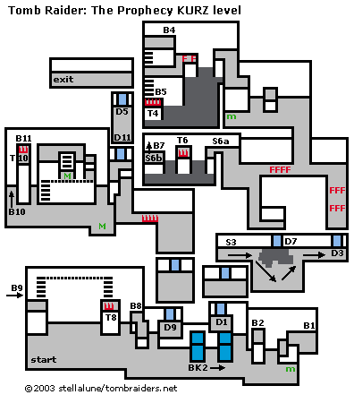 NOTE: Letter designations for buttons (B#), switches (S#), doors (D#), etc., in the text refer to labels on the corresponding level maps. The buttons are numbered to match their corresponding doors (e.g., button 1 opens door 1, switch 3 disarms trap 3, etc.). All pickups are marked on the map (I hope). Enemies and some hazards are noted in the walkthrough but not on the maps.