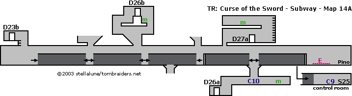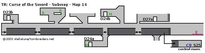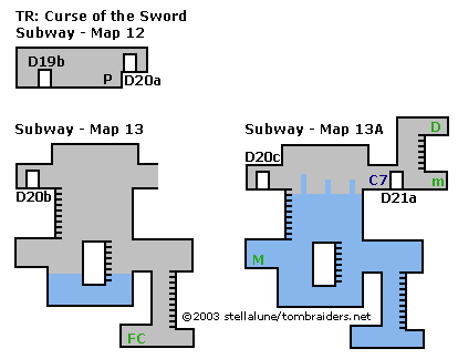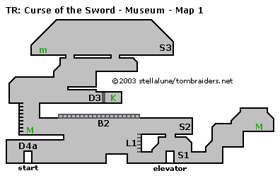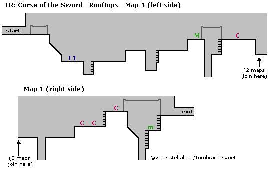 NOTE: Switches are numbered to match their corresponding doors, ledges, etc., (e.g., Switch 1 opens Door 1, Switch 3 extends Ledge 3, etc.). All pickups are marked on the map. Enemies and some hazards are noted in the walkthrough but not on the maps