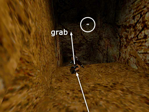 Turn so the golden river is on Lara's right and climb up out of the pit. Walk up the slope to the highest point and jump straight up to grab the ledge that juts out above; pull up. Cross to the far left corner and you'll see some shotgun shells (30) concealed on a small square ledge. Grab them, turn around and return to the edge of the ledge overlooking the golden river. (screenshots)