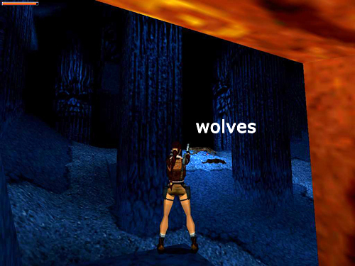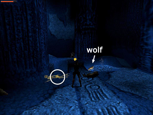 BLUE CAVE WITH INUIT WARRIORS: Enter the cave, start up the blue hill between the tall columns, and kill 2 wolves (5-6) that emerge from behind the columns. If you like, you can run out to get their attention and then roll and run back to the block near the entrance to shoot them from safety. (screenshot) There's a third wolf (7) sleeping in the far left corner of the cave. When you approach the skeleton with the small medi pack (7) at the top of the hill, the wolf will emerge. Stand there with pistols drawn and Lara will probably see it approaching before you do. (screenshot)