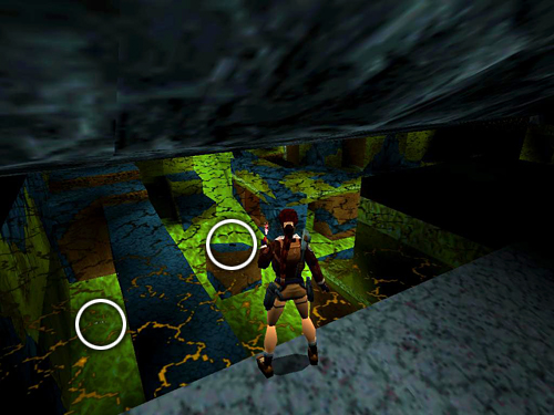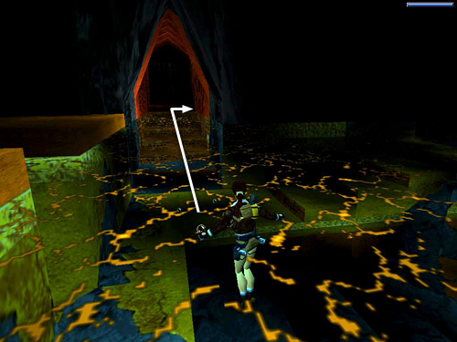STEPPING STONES IN MOLTEN GOLD RIVER: Move out into the open area, but don't rush. You don't want to run on into the river of molten gold. The camera shifts to show a wide-angle view of the area. Turn right and go through the dark area behind the big, square pillar to another ledge overlooking the river. Move to the edge and take a standing jump with Action to land on the gray block jutting out from the right wall into the river. Now make your way upstream, jumping from block to block: a running jump to the second block, standing jump to the third, running jump to the fourth, standing jump to the fifth. Then turn right and take a running jump to the sixth and last block. While standing there, you can pick off the polar bear (29) in the cave ahead using the M16. (screenshots)