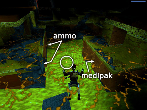RIVER OF MOLTEN GOLD: Walk to the end of the first ledge and take a running jump over the deadly molten gold to the next ledge. Move to the far left corner of this ledge and jump over to the rocky ledge on the left. Jump up the slope and then walk out onto the block on the right. Hop back and take a running jump to grab the back side of the angled block near the wall. Pull up, slide down the other side of the block, nearly to the bottom. Then jump to land on the angled block in the corner. Immediately jump again to land on the ledge with the grenades (26). (screenshots)