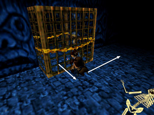 Now head for the other end of the hall, where the second spiked wall ended up. Find the metal cage wrapped in gold chain embedded in the left wall and push it twice to get into the passageway behind it. (screenshots) Go through to the next area.