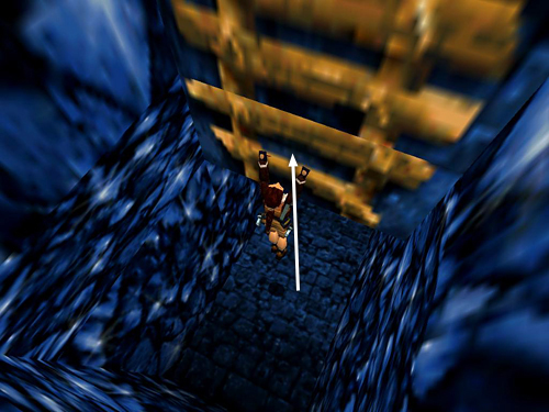 This room is laid out in the shape of a square. Go around to the side farthest from the entrance. Step into the doorway with the skeleton and immediately roll and run out to either side to avoid the boulder that rolls down the passageway toward you. (screenshot) Pick up the flares (20) among the bones and follow the hallway where the boulder came from, jumping over 3 spike pits along the way. (The grate in the floor doesn't open.) Soon you'll emerge on a ledge overlooking the BLUE CAVE.