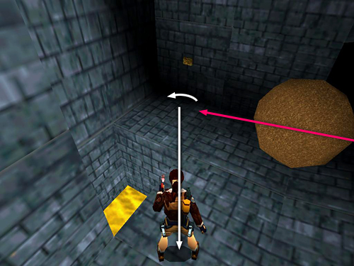 ROOMS WITH RAMPS AND BOULDERS: Head down the ramp to the left. Push the button to open the golden door next to it. Immediately backflip or climb up onto the ledge above the button to avoid the 2 rolling boulders. (screenshot)