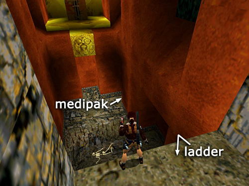 In the middle of this wide ledge is a receptacle for the MASK OF TORNARSUK. (screenshot) If you want all the pickups wait to place the mask. First approach the double doors on the right. They open and you can enter the room beyond. Climb down the ladder into the pit, walk through the spikes and take the large medi pack (50) in the alcove on the right. (screenshot) Then climb back out.