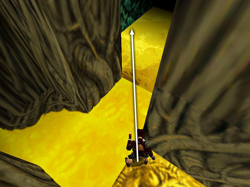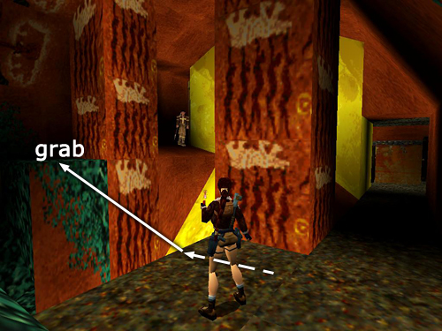 While standing on the bridge, turn around to face the ladder on the column (or possibly a square "tree") next to the bridge. If you move to the higher end of the bridge, you may be able to get another shot at the sasquatches above. If not, don't worry. Jump to grab the ladder on the tree. First climb down. Near the bottom, backflip off the ladder to land on the ledge behind. Take a standing jump from the BACK of the ledge to the molten gold square with 2 pairs of grenades (34-35). Despite its appearance, this square is safe; the rest of the pool is burning hot. Jump back to the ledge. Then jump to grab the ladder.