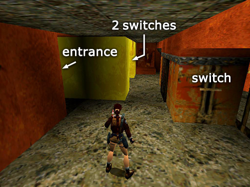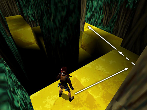GOLD WALKWAY WITH TRAPDOORS: When Lara lands here on the first square in a serpentine, golden walkway, you'll hear the sound of trapdoors opening. One of these is ahead on the right. If you don't care about getting all secrets, you can skip the next side area and continue with the section titled "GOLD WALKWAY WITH TRAPDOORS (again)," below.