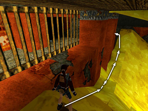 Take a running jump from the edge closest to where you picked up the clips to land on the sloping stone wall ahead. Slide back and grab the edge. Traverse as far as you can to the left and pull up onto a flat part of the wall. Turn left and walk carefully forward to the edge. It's dark here so take care not to step off into the molten gold. Stand at the edge and sidestep to the right until Lara is touching the wall. Pivot slightly to the left and take a standing jump onto the wooden bridge. Start toward the other end of the bridge but stop a little before the last section. Move to the right edge, adjust Lara's angle, and take a standing jump to land on the ledge with SECRET #2, the gold bars (24). Make sure you give Lara enough room to jump; it's easy to overshoot this ledge and land on the ramp behind it. If that happens, you'll have to reload or come all the way back around to get the secret. (screenshots)