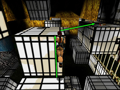 NOTE: There is a ladder at the back of the elevator shaft, which Lara could jump and grab; however, the elevator car above prevents her from climbing all the way to the top of the ladder. So ignore it for now.
