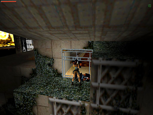 BUG WARNING: It is possible to descend by safety dropping from the walkway on the right side of the atrium onto one of the small, cement ledges below. However, doing this may cause a bug that will prevent you from finishing the level. To avoid this problem, just make sure you enter the ZOO before climbing down to the lower levels. Once you've done that, you can explore in any sequence you like. For details, see the footnote below.
