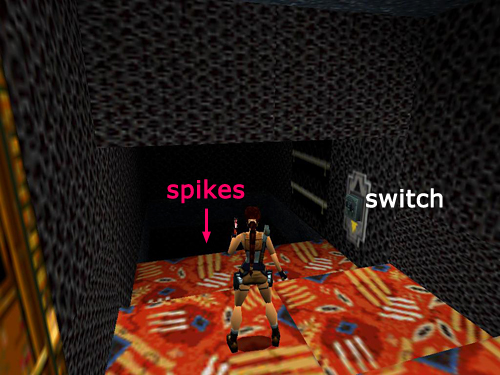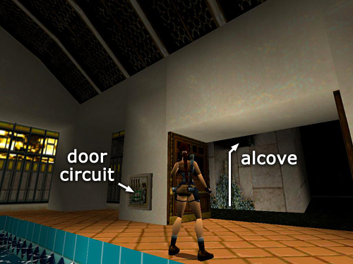 WARNING: Do not try hanging from the edge before you jump or dive. The trapdoor is triggered by Lara moving through the square directly in front of the spot from which you dive, and it only cycles once. So if Lara hangs from the edge and then pulls up, the trap door will open and close. (screenshot) Then when you attempt to dive, the door will remain closed and Lara will dive to her death.