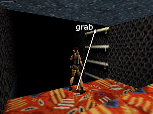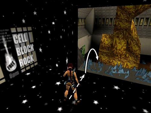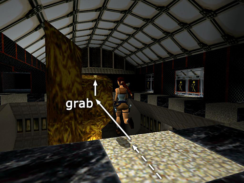 NOTE: When making this jump, be sure to aim for the left side of the slope. If Lara lands too far to the right, her feet will touch the slope below before she can grab and she'll slide down to the floor. Then you'll have to climb back up again.