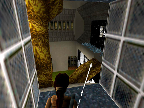 An easier (and far less terrifying) opportunity comes after you've killed the T. rexes. It involves using the Corner Bug to reach the highest point in the level. If you've never tried the Corner Bug before, refer to my Useful Bugs page for an explanation of how it works plus detailed instructions. Normally this technique works best at a convex corner with a flat, open area above and ledge or drop-off at its base, but here there's a corner without a ledge that still allows for fairly easy corner bugging.