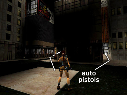 A short tunnel on the far side of the street can also be used to hide from the dinosaur. There are entrances on either side of the building straight ahead, and inside the tunnel you'll find the AUTOMATIC PISTOLS and 3 sets of clips (54-57). (screenshot) Just watch out for the nasty guy with the club (18) who comes around when you pick up the guns.