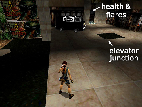 After you've killed both man and T. rex, follow the street away from the black-and-white c|net van parked near the entrance. This street leads into an open area with another van. In the square depression to the right of the second van, you'll find the ELEVATOR JUNCTION (58). (screenshot) Picking it up triggers the appearance of a second T. rex (19). Naturally. If you want to, you can take shelter in the small room with the black-and-white tile floor and the Bartoli poster hanging above it. Pick up the flares and large medi pack (59-60) lying on the floor but note that when you grab the health, another enemy with a club (20) approaches from across the street. Deal with him and then finish off the second dinosaur.