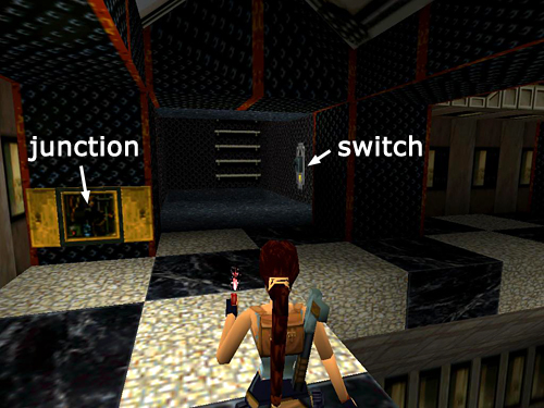ELEVATOR BETWEEN LOWER AND MIDDLE LEVELS: Pull the switch once to call the elevator. Pull it again and then step into the elevator and ride up. When the doors open, step out. Then pull the switch here to send the elevator down again. Take a diagonal standing jump to grab the ledge above the ladder inside the elevator shaft. This jump is a little tricky, but if you start on the seam between the two floor tiles Lara should make the grab. (screenshot) You can also run over the top of the elevator as it descends and then grab the ladder.