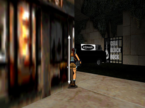 After killing the dinosaurs, move to the corner of the building just beyond the first c|net van. (screenshot) Use the corner bug here (screenshot) and Lara should pop up to the highest roof in the area, providing a spectacular view of Vegas at night—and Winston down below if you haven't locked him in the bathroom. ;) (screenshot/screenshot) Thanks to Kamila for sharing this find.