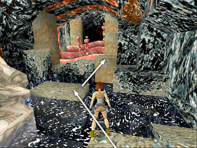 ROOM WITH BOULDERS & CHECKERBOARD FLOOR: Enter and pick up a small medi pack and magnum clips (1-2). Watch out for the small lava pits in the corners, and note the two closed doors on the side walls. Approach the alcoves just ahead and pick up 2 sets of Uzi clips (3-4). (Don't worry, the 2 mutants (1-2) in the alcoves won't come to life yet.)