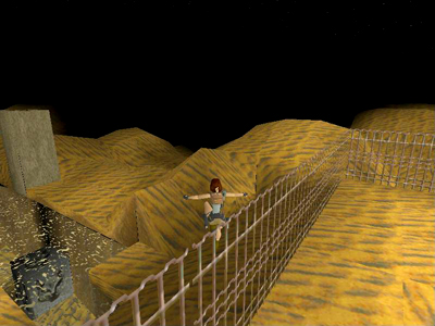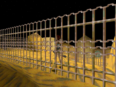 Go to the long fence through which you can see the pool beyond. Position Lara in the left corner (where one of the boxes of shotgun shells was) with her left hand against the fence and the yellow sandy hill behind her. Back up until Lara's back touches the sandy rock (as shown above).