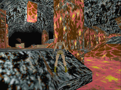 Now hold down the Jump key so Lara hops back and forth between the two angled slopes over the lava stream.