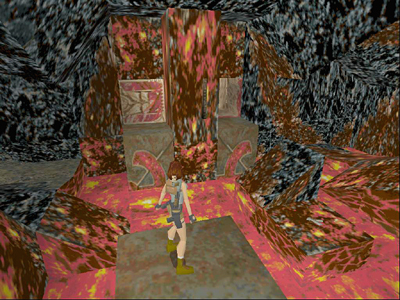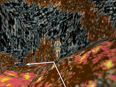 Run up the slope, veering to the left as you run down the path so that Lara is facing the end wall of the cavern. There's more lava ahead, so be careful not to run off the path. Try to aim for the back (right) edge of the last block in the path, as indicated by the pointer on the arrow in the screenshot above.